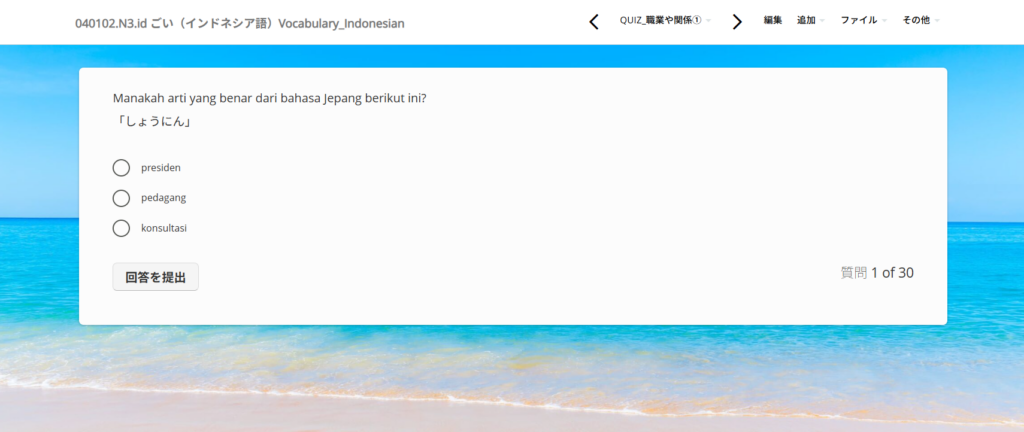 <05_JLPT N3コース> ー 01 語彙(ごい)Vocabulary ー 040102.N3.id ごい(インドネシア語)Vocabulary_Indonesian のQuizをインドネシア語でアップしました。 1本(ぽん)の動画(どうが)に対(たい)して、語彙(ごい)の意味(いみ)を答(こた... -