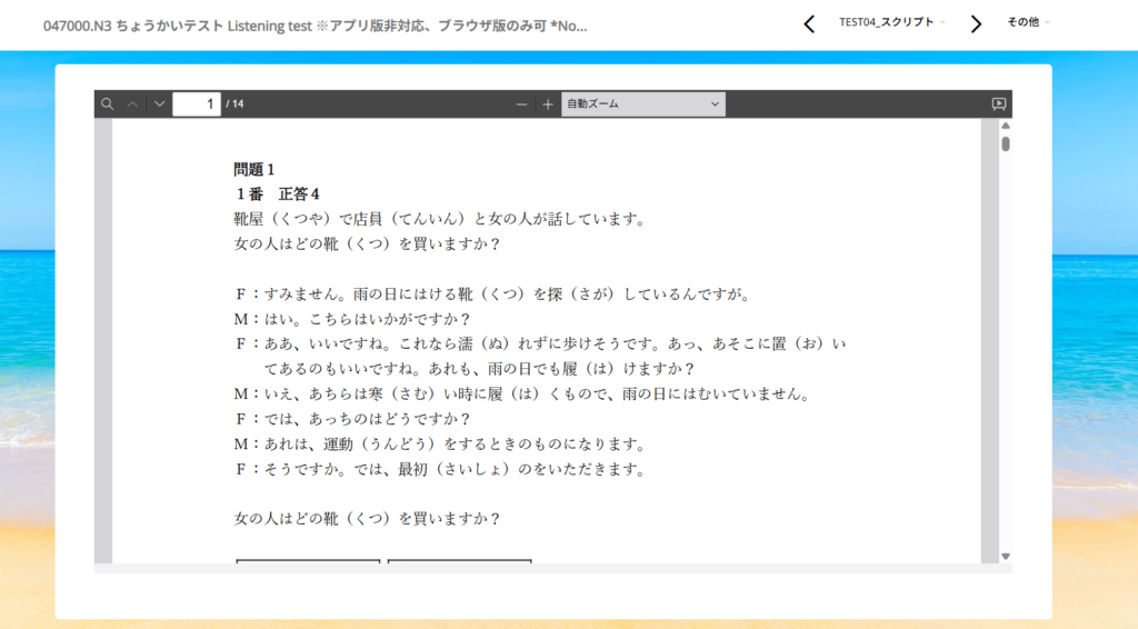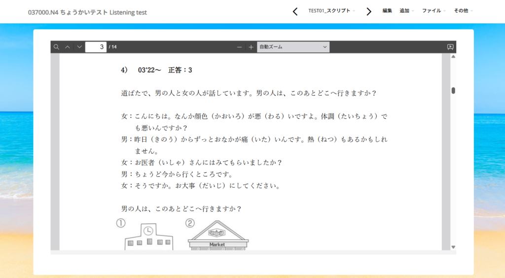 <04_JLPT N3コース> ー 05 テスト Test ー 047000.N3 ちょうかいテスト Listening test ※アプリ版非対応、ブラウザ版のみ可 *Not compatible with the app version. 内(ない)にスクリプトを追加(ついか)しました。 間違(まちが)えた問題(も... -