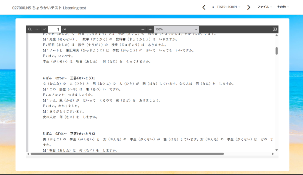 <03_JLPT N4コース> ー 05 テスト Test ー 037000.N4 ちょうかいテスト Listening test 内(ない)にスクリプトを追加(ついか)しました。 間違(まちが)ったところは、何度(なんど)もやり直(なお)しましょう。 -