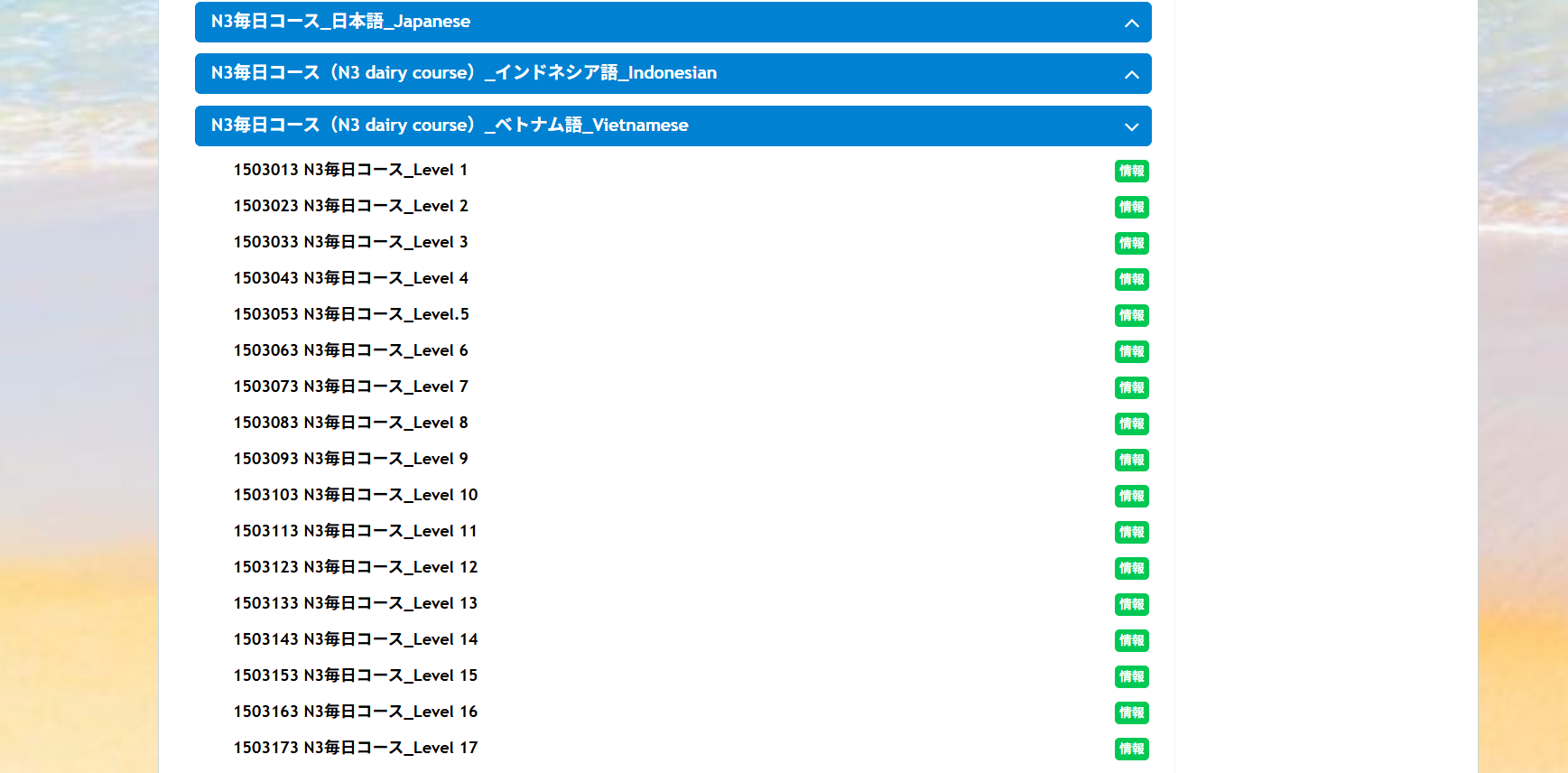 12/1 「N3毎日コース ベトナムご」をアップしました。 2025 12/03 2025年12月1日2025年12月3日 <15_N3まいにちコース(N3 dairy course)> N3毎日コース(N3 dairy course) _ベトナムご_Vietnamese を追加(ついか)しました。 毎日 コツコツ 勉強しましょう。 よかったらシェアしてね! URLをコピーしました! URLをコピーしました! 11/28 「N3毎日コース インドネシアご」をアップしました。 12/02 JLPT N3 ごい タイ語(ご)をカテゴリーごとにリニューアルしました。 この記事を書いた人 ichino 日本語教育でお困りの方に役立つ資料をこちらからダウンロード下さい。 無料トライアルで実際のシステムをお試し頂く事も可能です。 日本語カフェが分かる資料3点セットをご案内します 資料を請求する 実際に日本語カフェの機能がどのようなものか、お試し下さい 試してみる 関連記事 2/6 「特定技能(とくていぎのう)2号(ごう) 漁業(ぎょぎょう) 模擬試験(もぎしけん) をアップしました」 2026年2月6日 2/3 「特定技能(とくていぎのう)1号(ごう) 外食業(がいしょくぎょう) 模擬試験(もぎしけん) をアップしました」 2026年2月3日 1/30 企業(きぎょう)と自分(じぶん)を守(まも)るコンプライアンス講座(こうざ)をアップしました。 2026年1月30日 1/27 「特定技能(とくていぎのう)1号(ごう) 建設業(けんせつぎょう) 土木(どぼく)模擬試験(もぎしけん) をアップしました」 2026年1月27日 1/21 介護福祉士過去問解説(かいごふくししかこもんかいせつ)第33回(令和2年度)分 アップしました。 2026年1月21日 1/20 職場(しょくば)でのハラスメント対策講座(たいさくこうざ)コースをアップしました。 2026年1月20日 1/19 SSW宿泊業(しゅくはくぎょう)2号(ごう) 模擬(もぎ)テスト内(ない)にドリルを追加(ついか)しました。 2026年1月19日 1/19 N4ぶんぽう 音声解説(おんせいかつせつ)中国語/簡体字(ちゅうごくご/かんたいじ) を追加(ついか)しました。 2026年1月19日