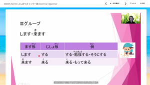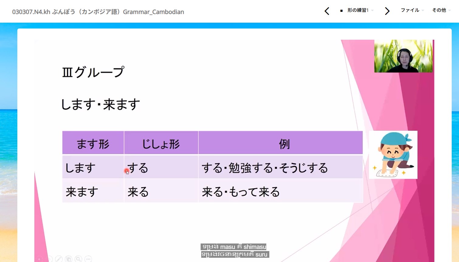 今(いま)までは、日本語解説(にほんごかいせつ)にカンボジア語(ご)字幕(じまく)が付(つ)いていましたが、カンボジア語(ご)での音声解説(おんせいかいせつ)にし、よりわかりやすい教材(きょうざい)になりました。文法(ぶんぽう)の勉強(べんきょう)は難(むずか)しいですが、何度(なんど)も動画(どうが)を見(み)て学習(がくしゅう)しましょう。